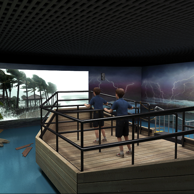 臺風(fēng)館采用先進的多媒體技術(shù)以及和實景相結(jié)合的逼真效果來模擬臺風(fēng)發(fā)生時的情景。